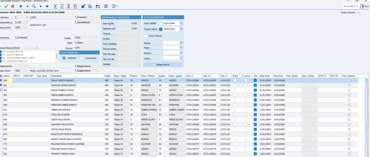 La gestione dell'ARCHIVIO TESSUTI consente di gestire facilmente le collezioni dei tessuti. Ogni articolo tessuto è stato catalogato per produttore, tipo materiale, altezza e colore. Ad esso sono state assocciate le impostazioni standard necessarie per lavorare il tessuto, come il colore delle finiture, il passo e il colore della guaina.